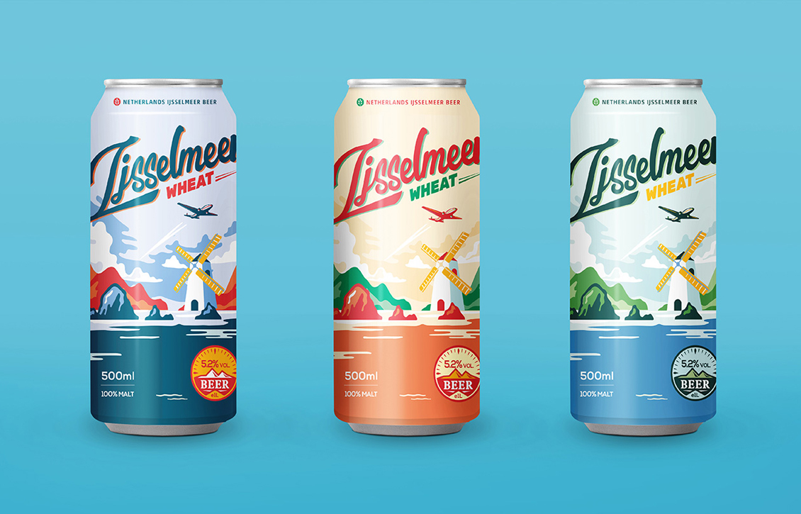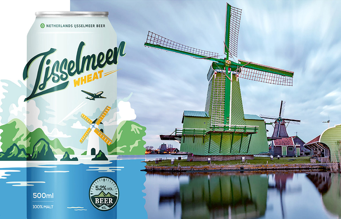 通过色彩对比,画面上的黑美人由远抓住消费者的眼球,并营造出一种神秘的性感,标志作为及近后的第一识别符号被凸显出来。搭配德国国旗的主色调,共同诠释着产品德式精酿的属性,营造了德式黑美人精酿啤酒的文化气息与浪漫优雅的永恒格调。创建一个有明确目标与主旨的视觉画面,强调与国家荷兰的领土联系,围绕地理信息建立故事线,这个概念诞生了 “艾瑟尔精酿啤酒”的包装设计。将荷兰风车、艾瑟尔湖泊等自然元素进行结合,抽象出风和日丽的和谐画面。这种现代颜色放置在商品货架上,具有强烈的视觉感召力和表现力。团队用画面连接地标,助力客户打赢了这场与竞品之间的消费者心智视觉“争夺战”。