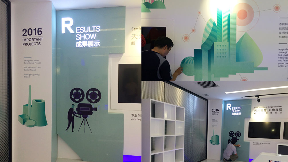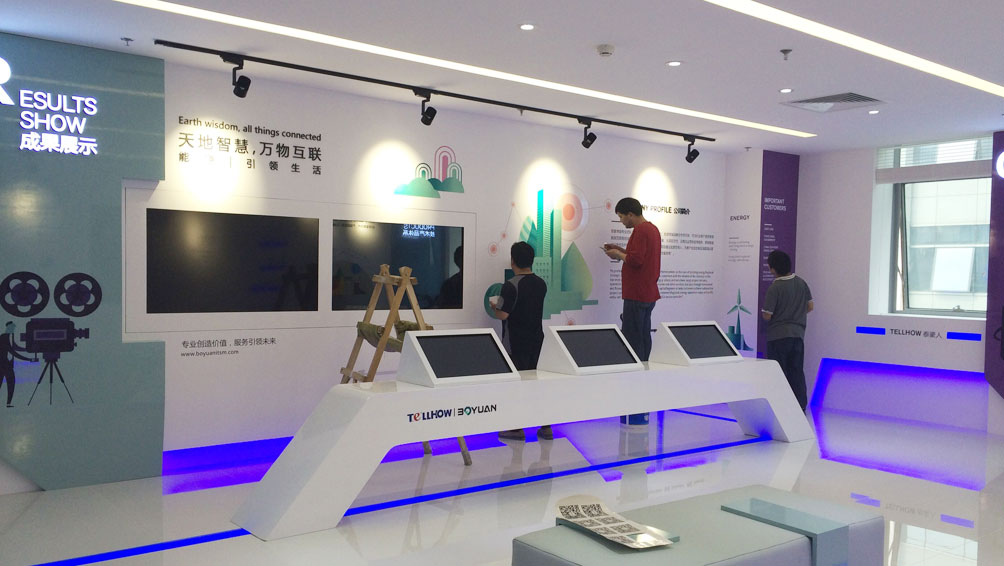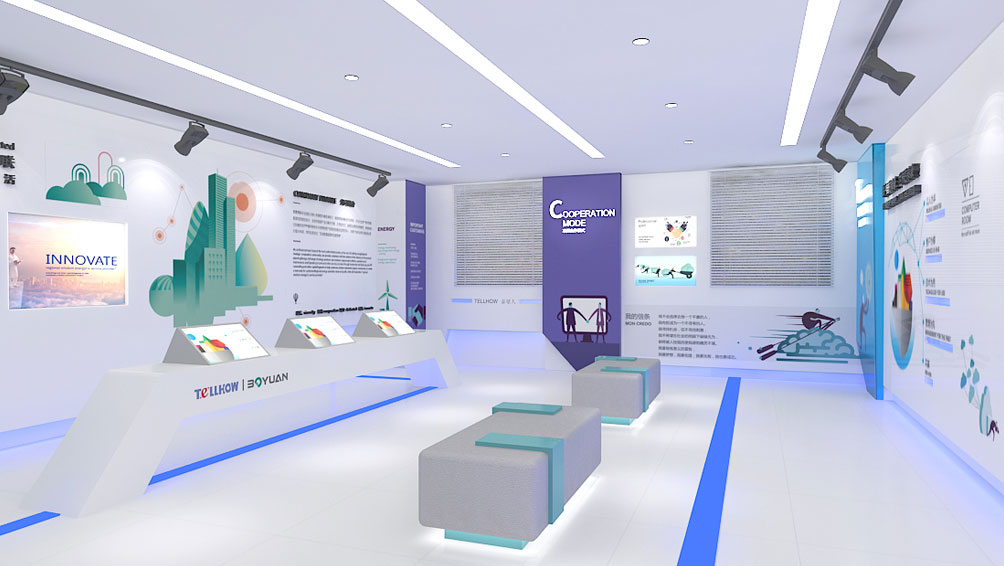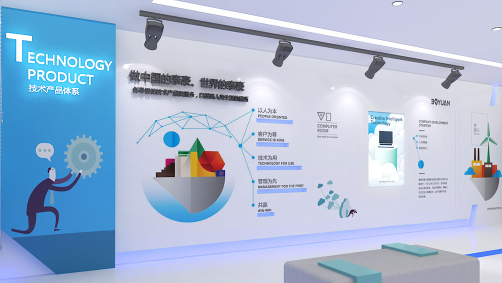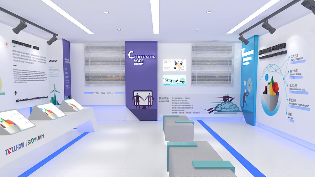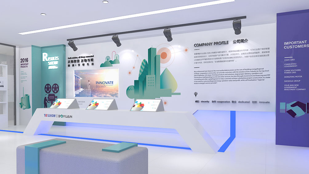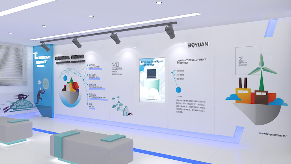 有关博辕的企业展厅设计,企业信息的传递过程中不但要平面化、特色化、简单易懂,使产品与企业理念内涵相呼应,同时通过展厅的整体形象设计为博辕创造、培养主力及潜在的消费群体,获得稳定的收入和利润。由于博辕致力于综合IT服务业务,立足能源行业,因此整个展厅的设计围绕“科技、环保”这一理念进行,整个展馆主要以蓝色为主色调并搭配适量的灰色,在体现企业行业属性的同时,使其更具有时代感;饰面板、石膏板、玻化砖等材质的运用,既环保,造价又低,不但缩短了工期的同时还为客户节省了一些不必要的开支。展馆整体规划分为三大板块,第一版块为企业介绍与成果展示、第二版块为项目合作模式、第三版块为技术产品体系,不同板块以不同程度的蓝色调来区分,内容展示上则以“互联网信息图表”的形式进行展现,使繁杂的信息传达的更加简洁有效地传达出去,每个板块以文字加相应的配图来呈现,如“成果展示区”,有一个大型的电视机用来播放企业相关视频,左侧则选了一幅放映机的图片来增强展示效果。设计师对于展厅细节的展现,使整个展厅内容更加丰富化的同时,也体现了展厅人性化设计的一面,地面蓝色灯带的交叉设计,体现了资源共享、互联网思维特性,各种多媒体技术的应用,使整个展厅更具有时代感与行业特色,座位与茶几的组合,更体现了人性化的一面,无论是展厅布局还是展示应用,妙集都为博辕全力打造了一个集企业理念、企业思维,综合实力为一体的对外传播中心,使其成为博辕集团全部思维的汇聚地。