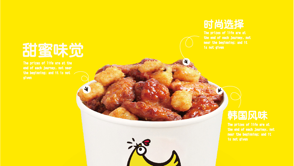 此次设计不同于平时普通炸鸡类品牌设计,妙集团队通过独特的创意策划与设计,使得项目能够在市场开展中独领风骚。设计师团队在制作logo、VI、以及吉祥物的时候趋于时尚、品味、新颖、有寓意,并且利用色彩以及标志设计打造第一视觉识别元素,能让消费者清晰认识该产品的独特性,不至于与普通炸鸡店面相混淆,削弱该项目的市场竞争力。