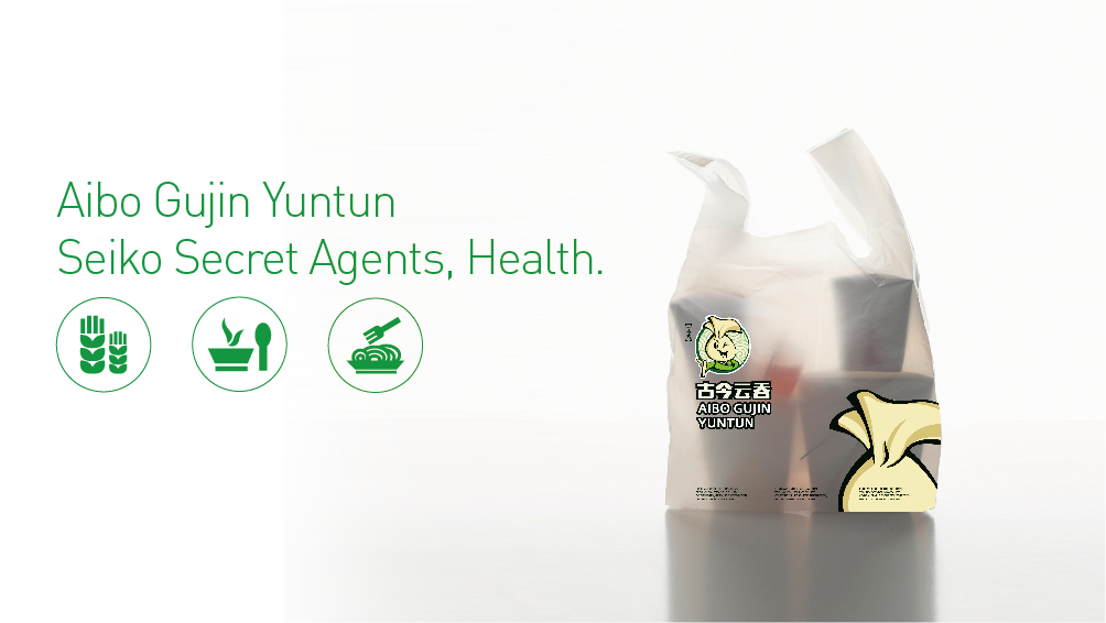 标志利用云吞的造型为创意出发点,通过拟人化的手法演变为健康快乐的人物造型,也是对企业产品云吞营养健康的一个暗示。并且利用中国传统的人物服饰,充分传达了云吞悠久的饮食文化,中国传统云纹背景图案的使用,传达给受众吉祥如意的意思。而品牌标准色彩的选择不仅象征着产品营养健康,同时通过冷暖色调的对比更能增强其视觉冲击力与食欲感。当然也能够给人传达出清真的品牌气质。