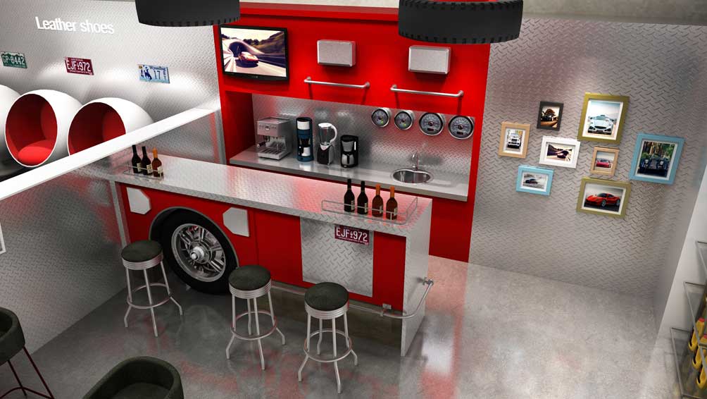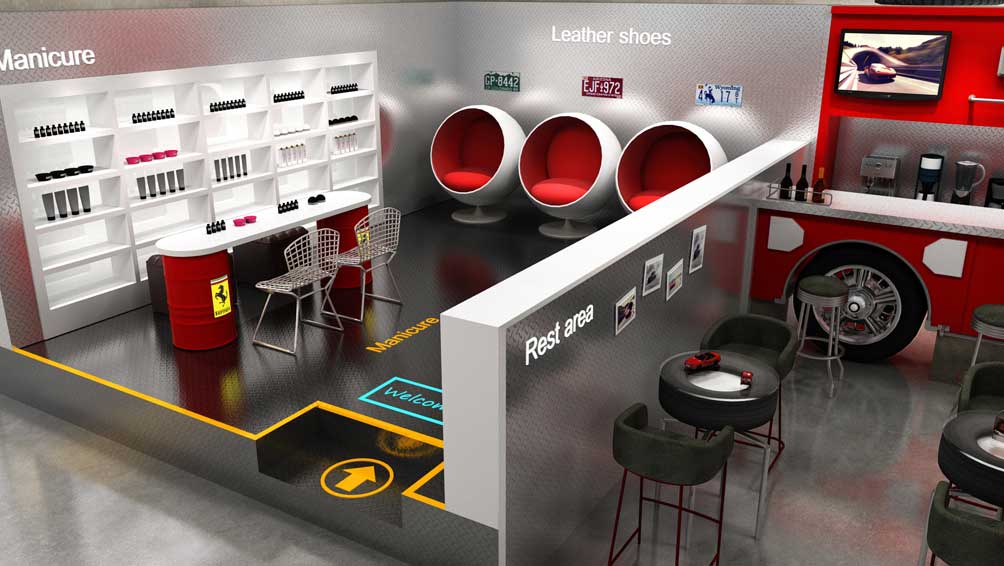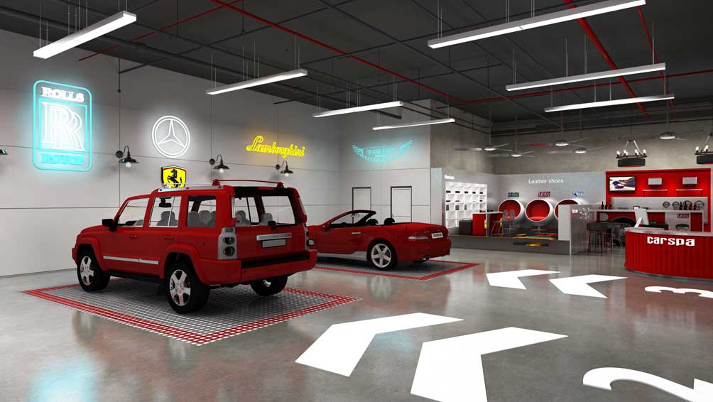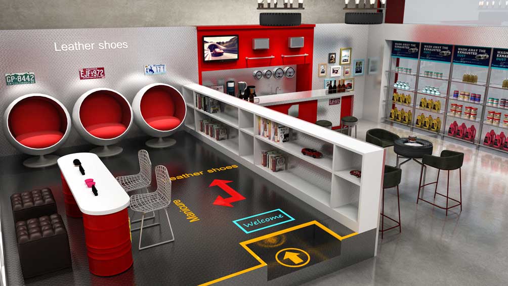 为了将清速动力“人性化服务”这一理念更形象地贯穿于整个店面空间中,妙集品牌在设计上采取现代手法,时尚大气的门头在肌理漆的运用下更有层次感,红色铁丝网与灰色调相呼应,让整个店面看起来更加时尚动感,有活力。全透明落地玻璃门窗,使整个内部空间一目了然,服务场景更加透明化。店内区域划分清晰,洗车区、休息区、美甲区、产品展示区等既协调统一又各有特色。洗车区宽敞明亮,简洁大方,裸顶、防水铝塑板、指示贴、不锈钢地漏等处处体现清速动力人性化的服务,墙面上配以霓虹灯点缀,给严谨的工作间增添了一丝活力。接待区以品牌色为主,加以不锈钢与金属板的运用,给人以温馨,时尚及舒服的感觉,左侧精品实际陈列区以落地玻璃窗为背景墙,运用不锈钢作为支架,给人以整洁,时尚的感觉。休息区与产品展示区相连,轮胎吊灯、轮胎桌椅再配上仪表盘、电视、红酒、照片墙这些软装配饰使整个空间更加丰富有情调。美甲区与休息区用矮隔断隔开,即保证了相对的私密性,又具有一定的通透性。油桶形底座的操作台、曲线型座椅的设计使整个简洁的空间增添了一丝趣味。