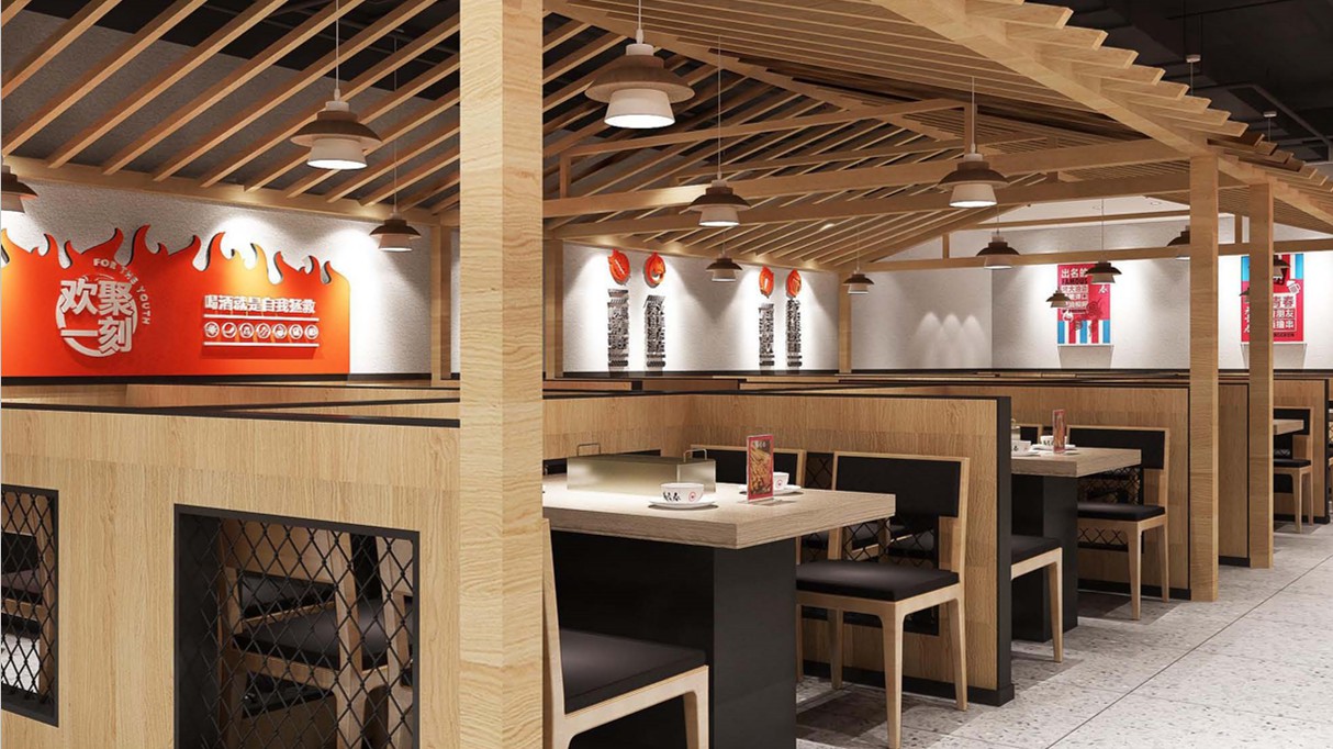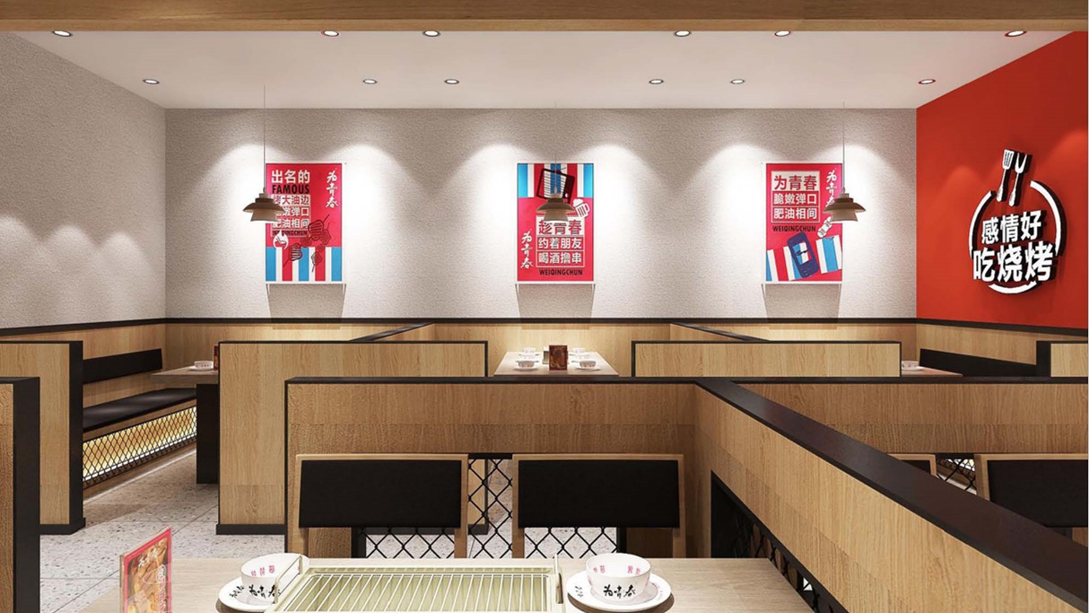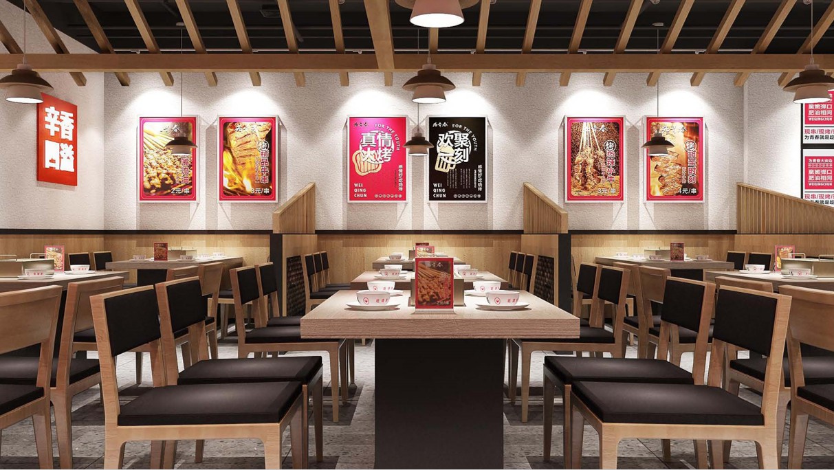 为青春烧烤整个空间设计创造出流线的空间造型,结合功能布局,创造出流线的灵动的空间氛围。