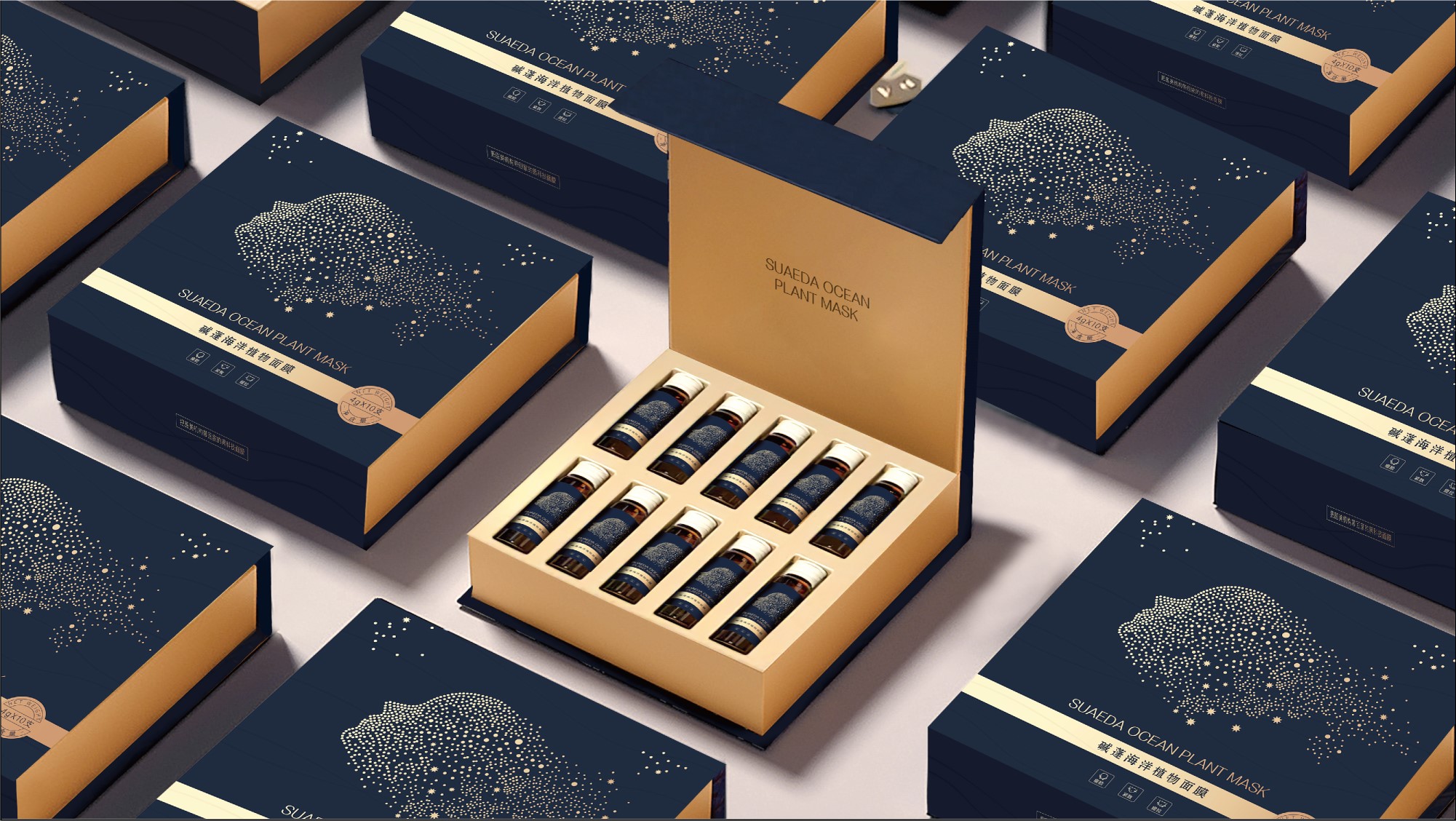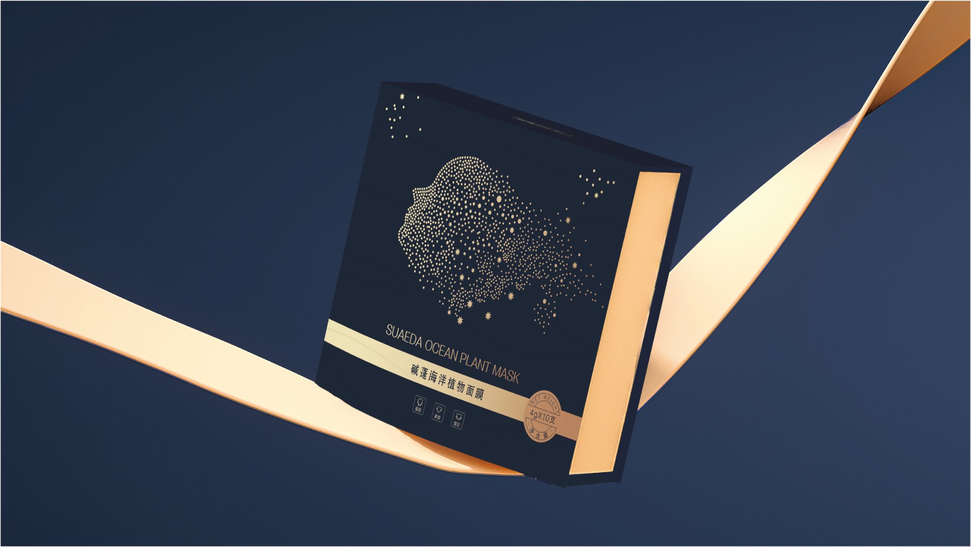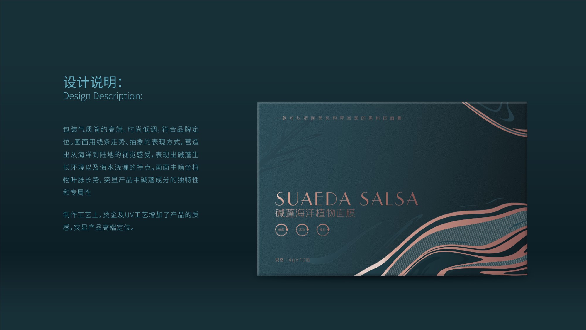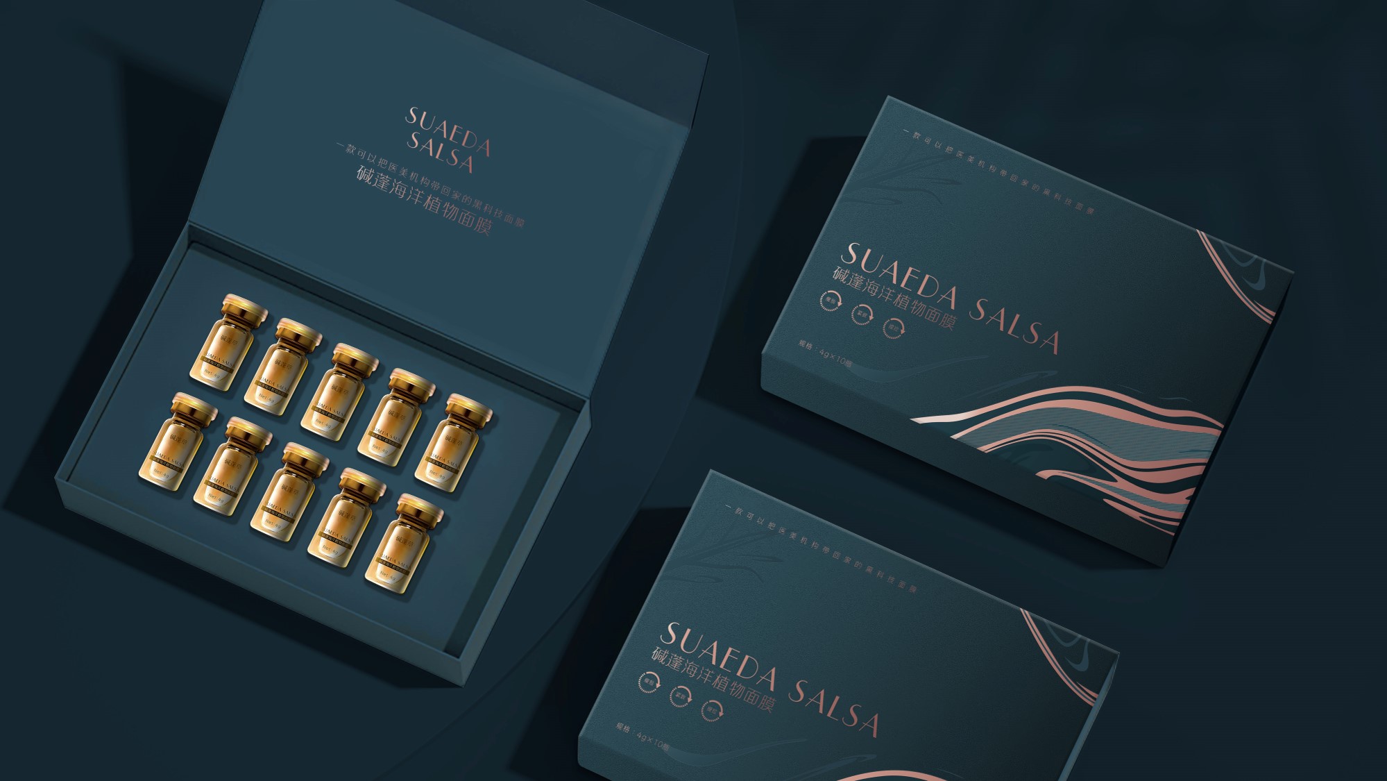 包装气质简约高端、时尚低调,符合品牌定位。画面用线条走势、抽象的表现方式,营造出从海洋到陆地的视觉感受,表现出碱蓬生长环境以及海水浇灌的特点。画面中暗含植物叶脉张师,突显产品种碱蓬成分的独特性和专属性。