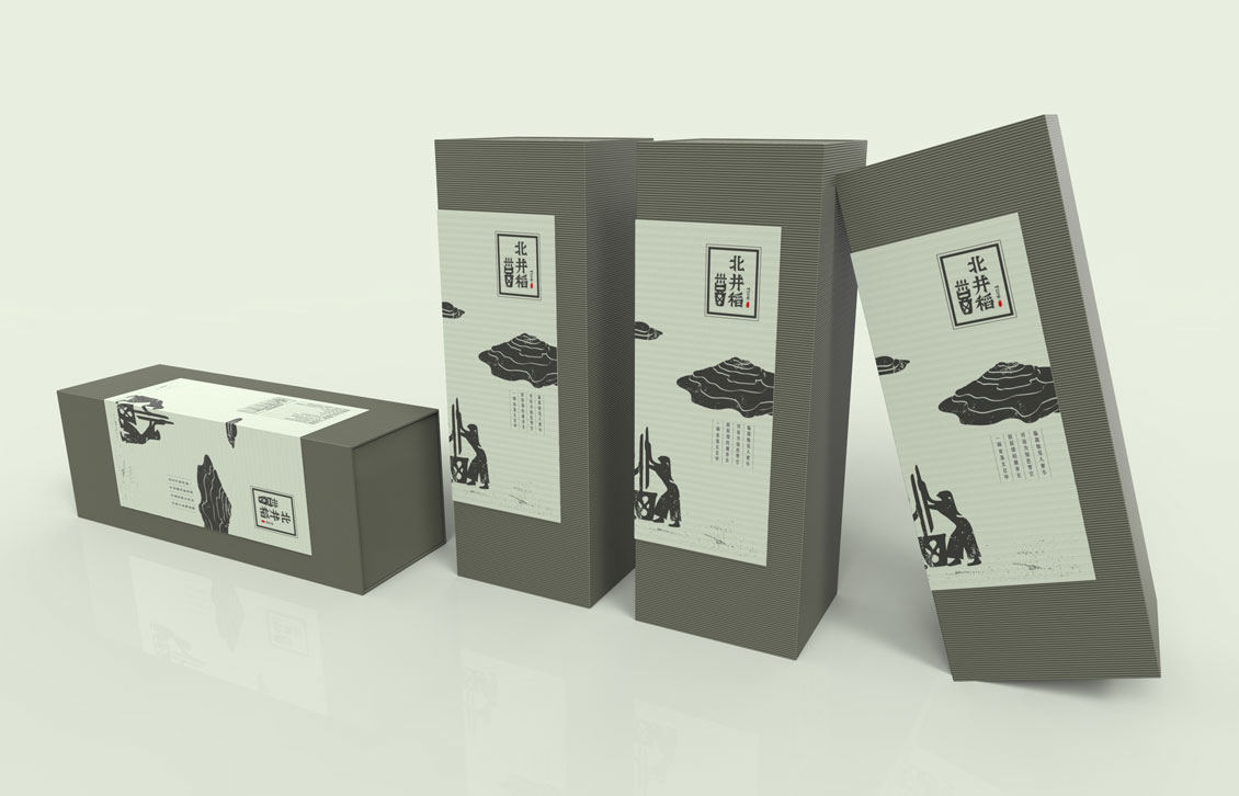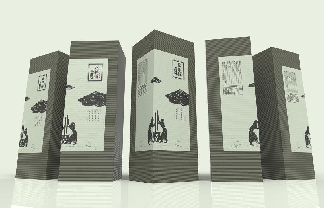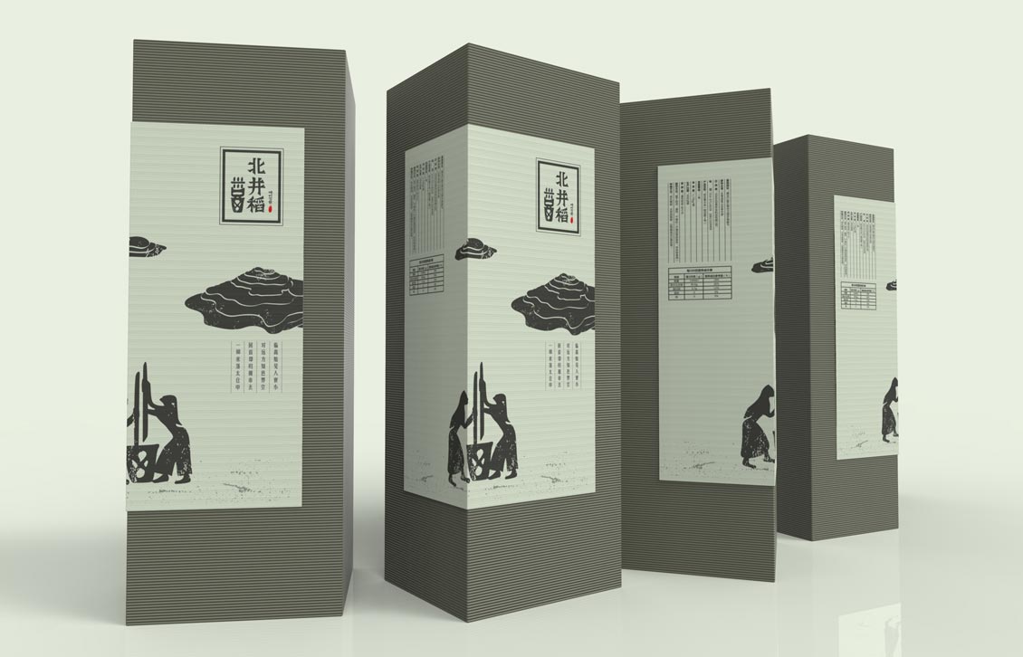妙集团队首先明确北井稻原生态有机米的定位,同时对其直接与间接竞品进行分析。在品牌策略层面更加确定了北井稻原生态、纯自然、精致生活的品牌定义。首先从修正其品牌标志开始,保留其甲骨文“稻”为基础设计元素,在广告语层面直接体现北井稻,原生态有机米。是其在保留了原始文化传承的基础之上,品牌的传达更为直接有效。在包装设计阶段,以甲骨文的设计风格进行延展,将“稻”字更为具象拟人化,同是配合远古岩画的设计元素,着重体现了北井稻的原生态的品牌定位。在后期落地印刷纸张与工艺的选择上,也力求具有淳朴、自然风格的瓦楞纸及牛皮纸作为主要载体。重塑后的北井稻品牌形象,准确地传达了其品牌的价值倡导,同时又与其目标消费群体形成了直接的价值共鸣。