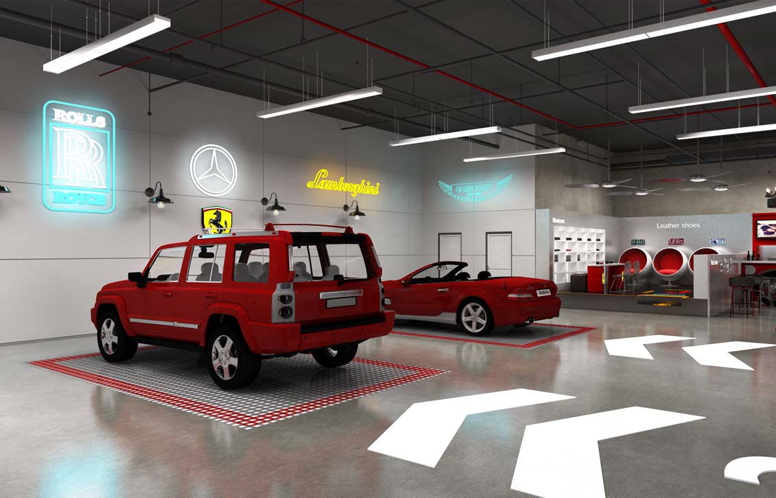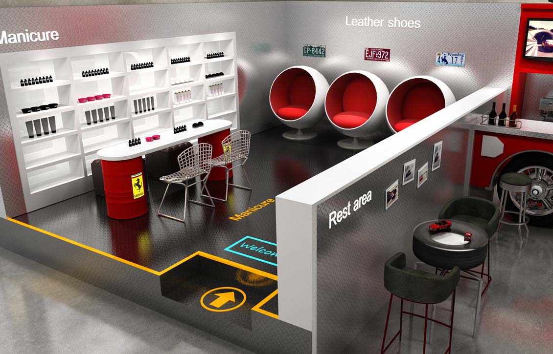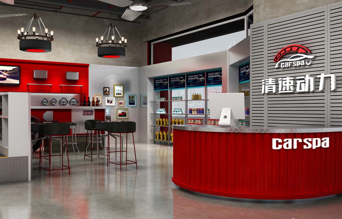 为了将清速动力“人性化服务”这一理念更形象地贯穿于整个店面空间中,妙集品牌在设计上采取现代手法,时尚大气的门头在肌理漆的运用下更有层次感,红色铁丝网与灰色调相呼应,让整个店面看起来更加时尚动感,有活力。全透明落地玻璃门窗,使整个内部空间一目了然,服务场景更加透明化。店内区域划分清晰,洗车区、休息区、美甲区、产品展示区等既协调统一又各有特色。洗车区宽敞明亮,简洁大方,裸顶、防水铝塑板、指示贴、不锈钢地漏等处处体现清速动力人性化的服务,墙面上配以霓虹灯点缀,给严谨的工作间增添了一丝活力。接待区以品牌色为主,加以不锈钢与金属板的运用,给人以温馨,时尚及舒服的感觉,左侧精品实际陈列区以落地玻璃窗为背景墙,运用不锈钢作为支架,给人以整洁,时尚的感觉。休息区与产品展示区相连,轮胎吊灯、轮胎桌椅再配上仪表盘、电视、红酒、照片墙这些软装配饰使整个空间更加丰富有情调。美甲区与休息区用矮隔断隔开,即保证了相对的私密性,又具有一定的通透性。油桶形底座的操作台、曲线型座椅的设计使整个简洁的空间增添了一丝趣味。