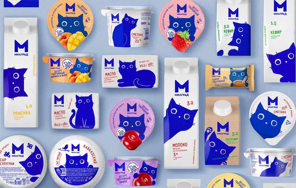 Bryansk乳品厂与品牌代理公司Depot合作,对其牛奶品牌Milgrad进行新的品牌定位,包括重新设计品牌Logo和推出更具活力的新包装设计,以建立与观众的情感联系,使Milgrad成为一个快乐的乳品品牌。起初,设计团队重新设计了 Milgrad 的品牌标识。虽然保持了原来的蓝色,但图形解释更加现代和直观。大写的“m”和猫头的巧妙组合使它成为最令人难忘的视觉元素。