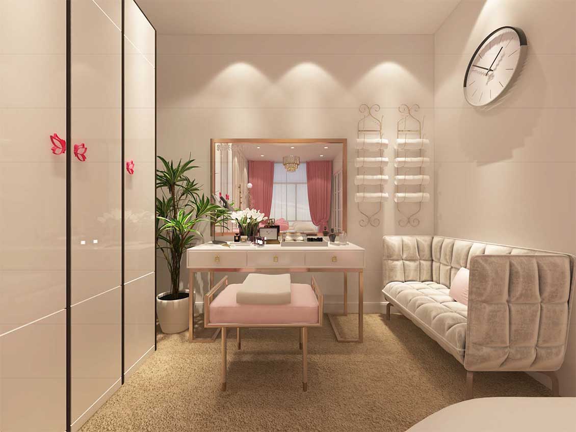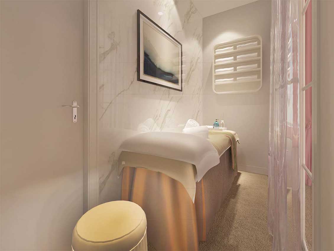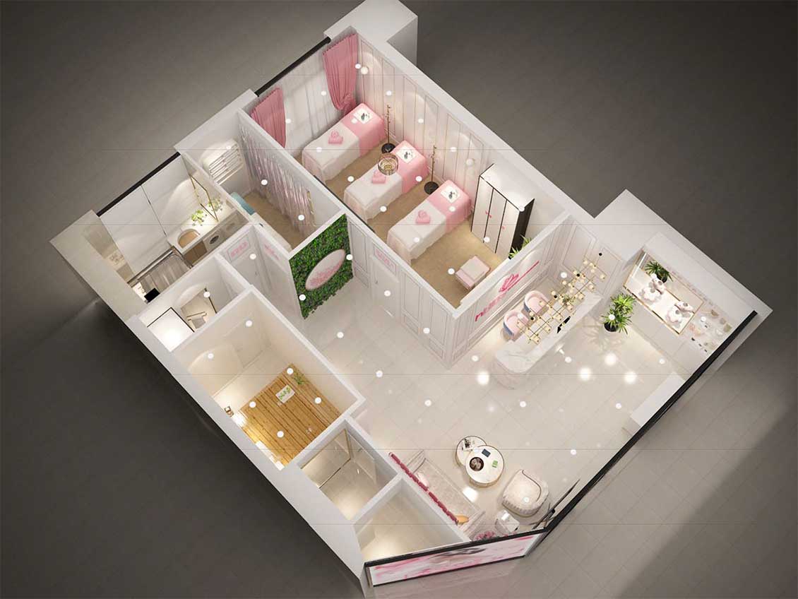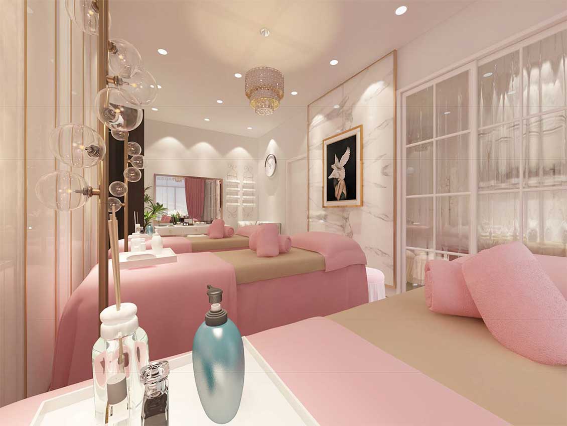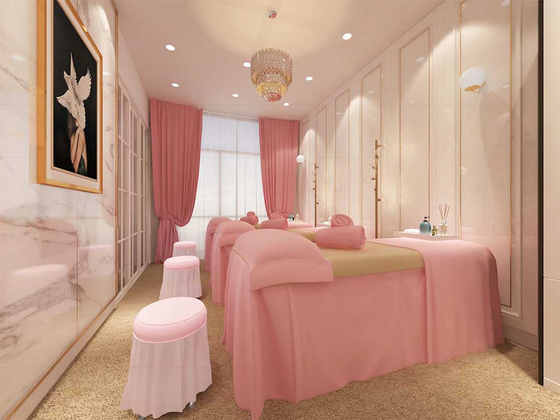 新来福美容项目整个空间设计中根据女性的特征创造出流线的空间造型,结合功能布局,创造出流线的灵动的空间氛围。
