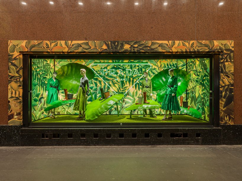 展示窗的设计概念结合了现实和想象,包括多种背光墙纸作为背景,展示各种不同的自然景观——树木和观音莲、龟背竹、无花果或蕨类等巨大的树叶,并使用绿色或黄色的普拉达三角形用以标记大型霓虹灯丰富的场景。超级叶子在产品展示和地面部分使用了多种对比色——绿色、黄色、橙色和粉色,进一步改善了整体氛围。