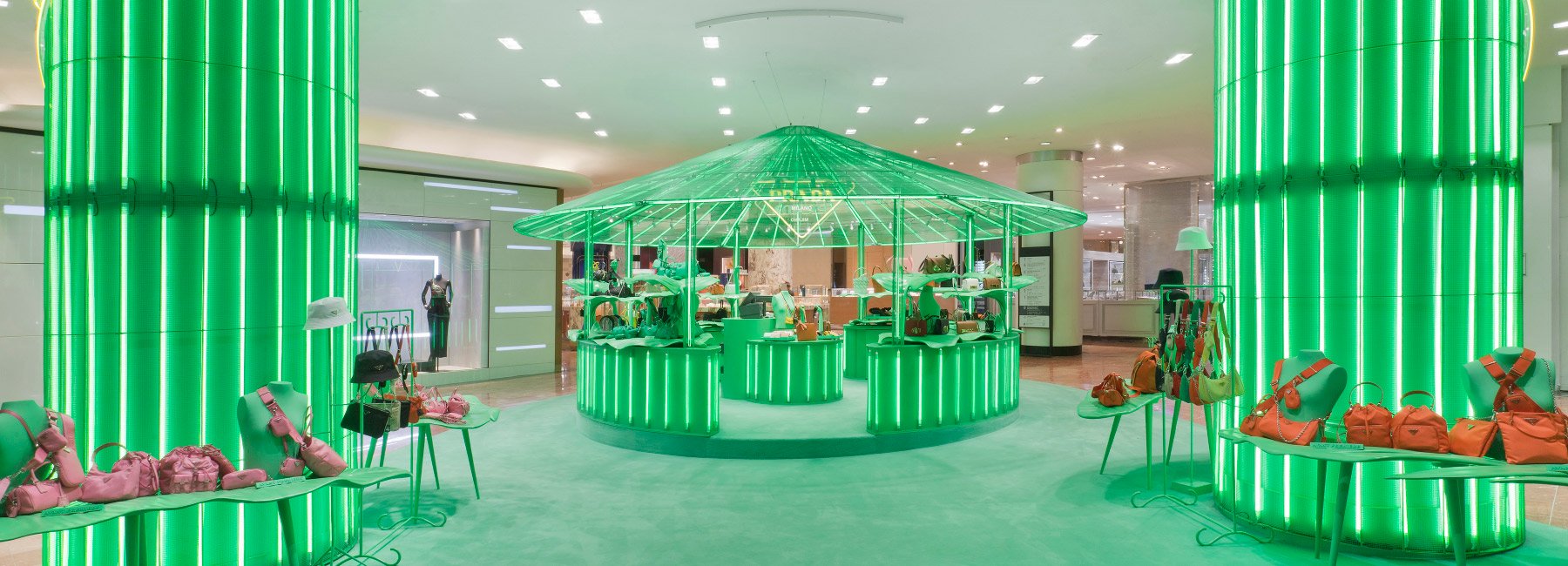 女装快闪店总零售面积约77平方米。有一个由绿色漆面金属网、霓虹灯和绿色地毯组成的“森林展厅”。男装的空间是由一棵巨大的猴面包树定义的,树上装饰有金属网和霓虹灯。该设备还配备了三个三角形的普拉达标志。大叶展示、餐桌、背光墙灵感来自大自然,衣架悬挂平台和绿色表面补充了整体展示设计。