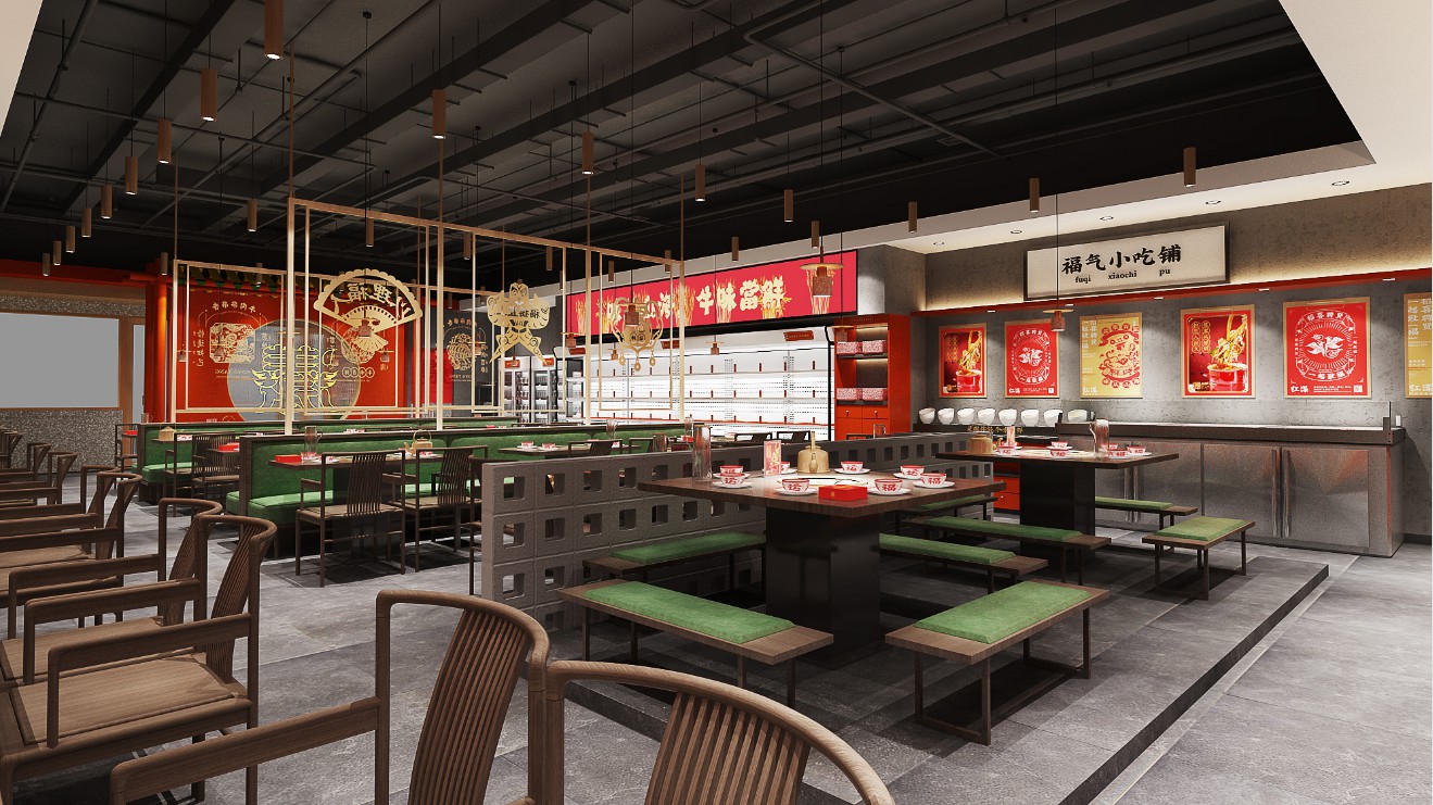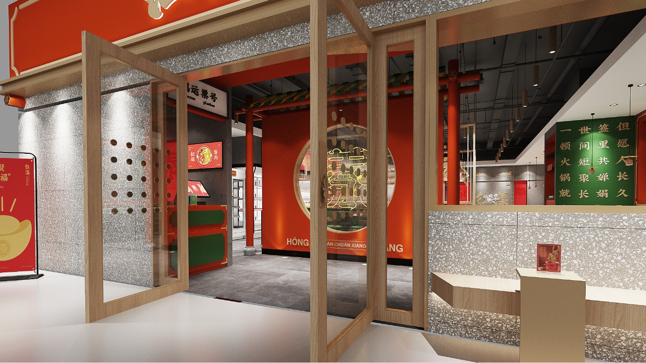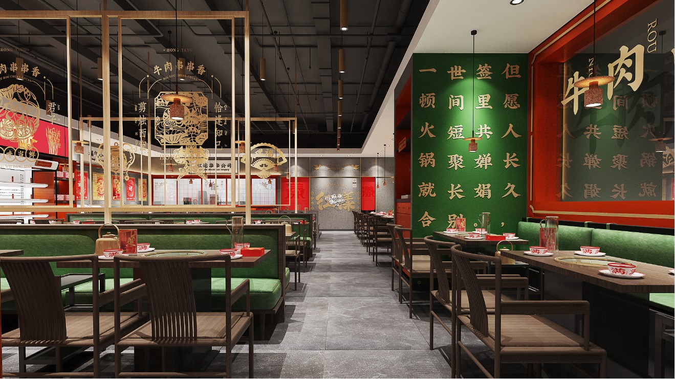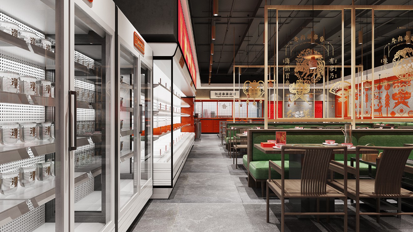 红漾串串香整个空间设计创造出流线的空间造型,结合功能布局,创造出流线的灵动的空间氛围。