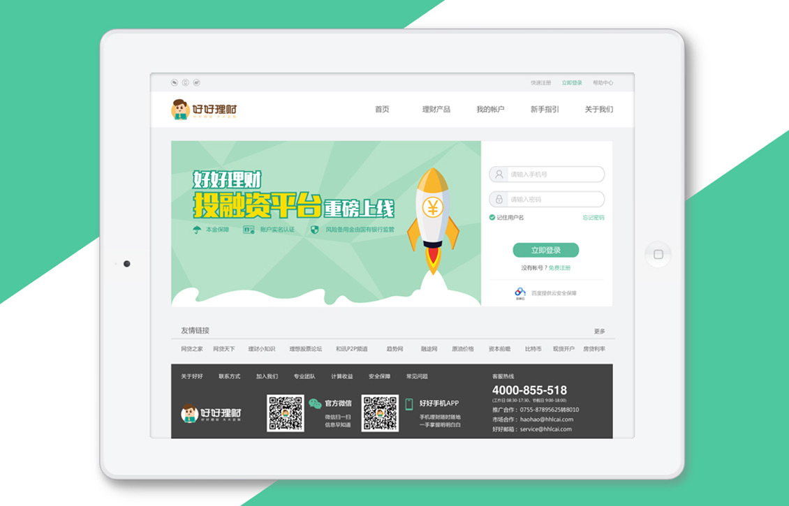 为了加深投资人印象,深化品牌形象,在与客户充分沟通之后,妙集项目团队为好好理财设计了“好好先生”的品牌形象,该形象灵动可爱,萌萌的却又不失持重,符合品牌受众认知,易于为其所接受。在终端设计上,简化系统程序,明晰操作流程,风格品牌形象达到高度统一。具体创作理念方面,妙集项目团队着重体现专业、精练、友好、共赢等元素,极大推动了好好理财品牌的市场的识别与推广,增强了品牌与投资人间的信任与默契。