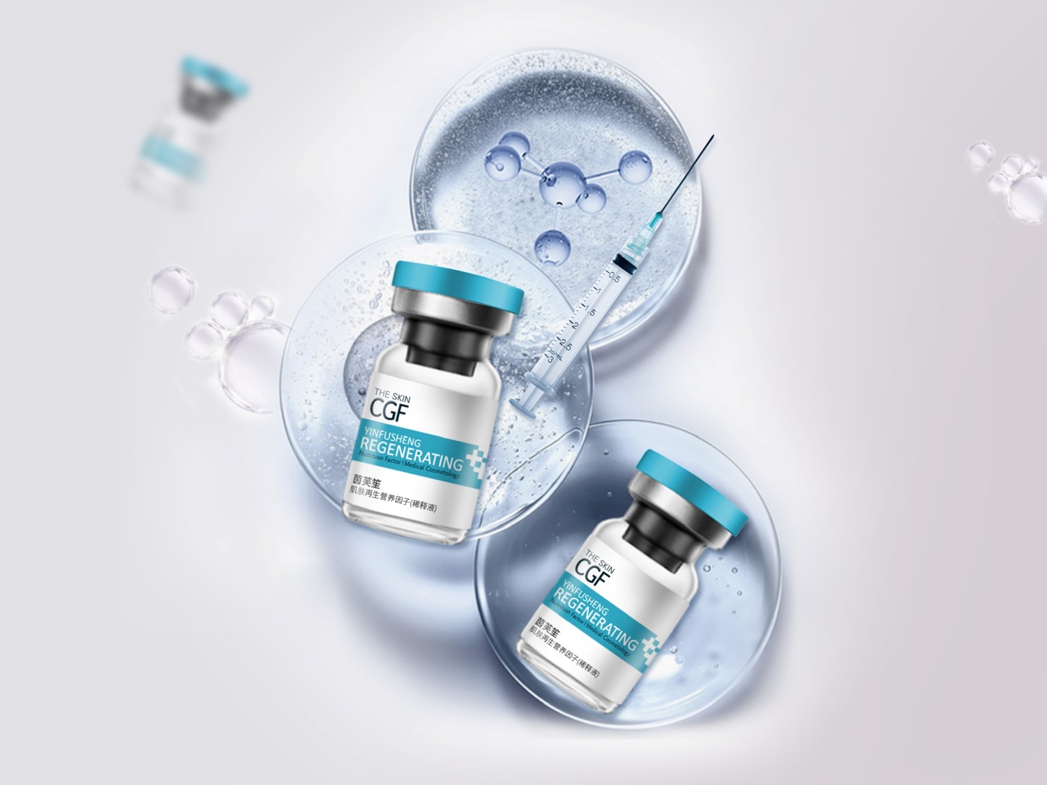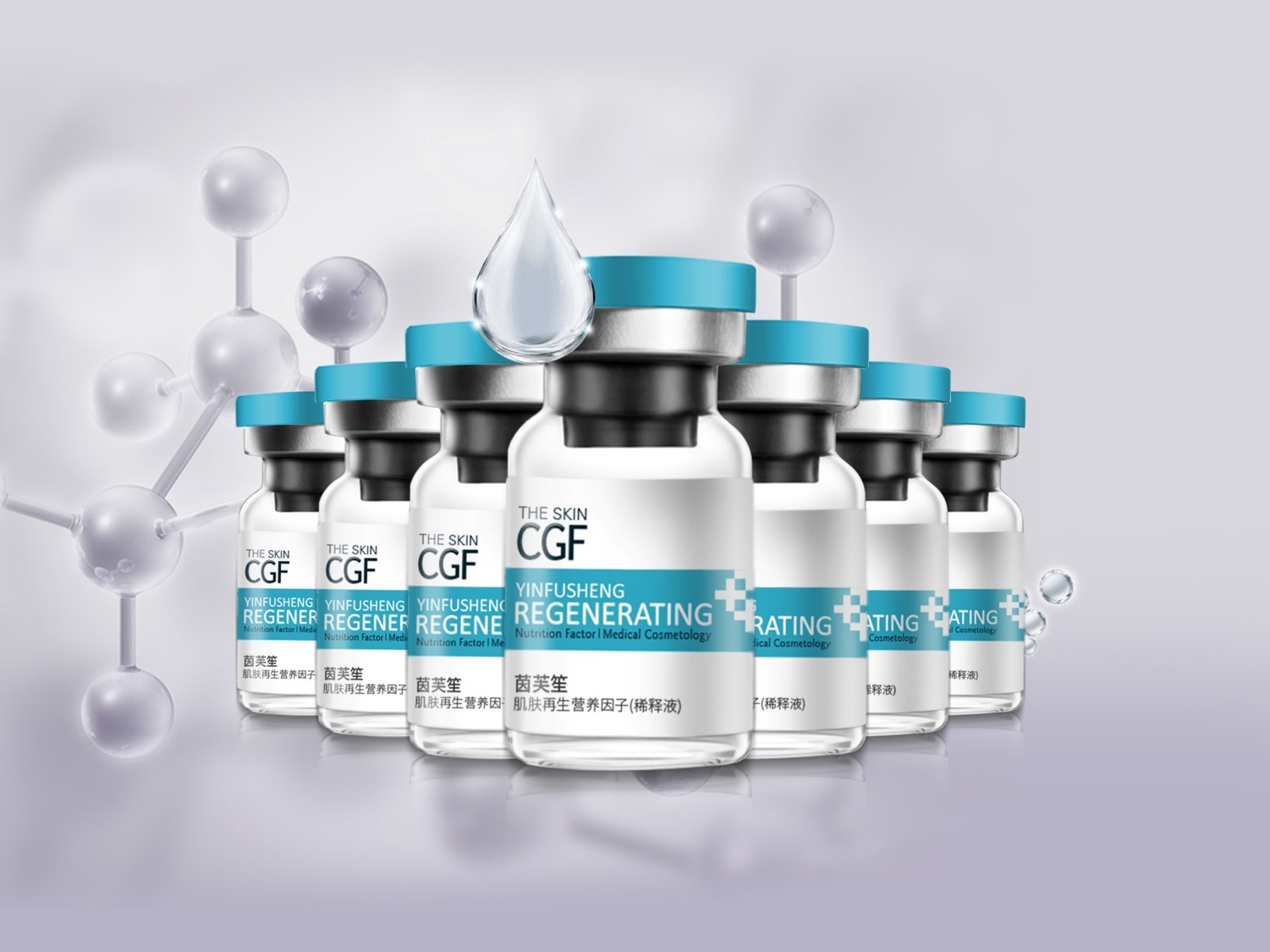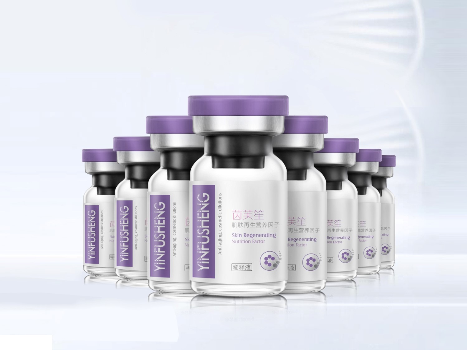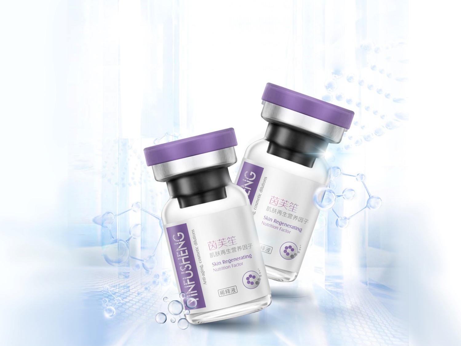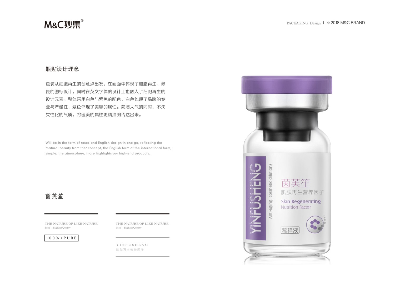 包装从细胞再生的创意点出发,在画面中体现了细胞再生、修复的图标设计,同时在英文字体的设计上也融入了细胞再生的设计元素。整体采用白色与紫色的配色,白色体现了品牌的专业与严谨性,紫色体现了美容的属性。简洁大气的同时,不是女性化的气质,将医美的属性更精准的传达出来。