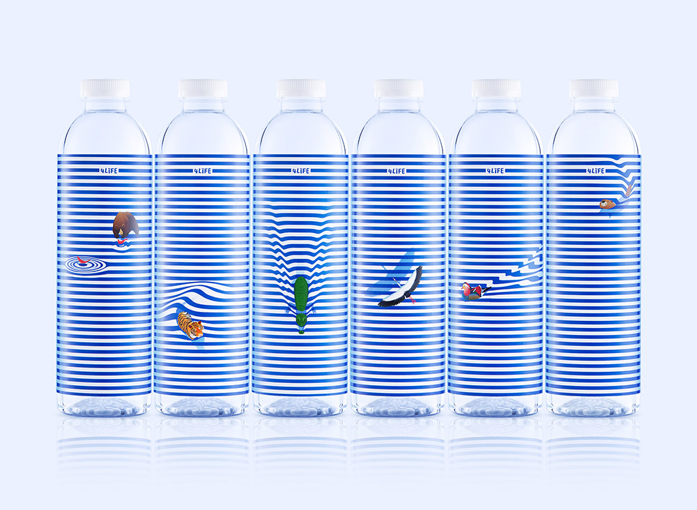 4LIFE与国际战略品牌Prompt Design的泰国办事处密切合作,为矿泉水品牌4LIFE打造新的包装设计。通过包装,它不仅传达了清洁的水源,还向消费者传达了自然生态的重要性。细长的瓶身设计上,蓝色条纹勾勒出水波的美丽。各种与水关系密切的动物被添加在蓝色条纹之间。有会游泳的老虎、会爬行的鳄鱼、会飞的火鸟和无忧无虑的水獭……它们在水中自由游动,不时会引起涟漪。