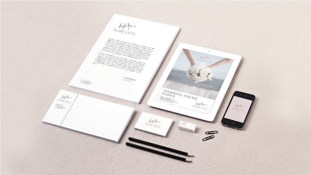 妙集设计团队通过对希冀城婚庆主题公园项目规划的思考,并与国内外相关的婚庆产业做对比与分析,确定了对希冀城婚庆主题公园品牌建设的创意构想:1、希冀城婚庆主题公园项目处于建设期,需要通过品牌识别的独特设计,打开品牌的知名度,塑造品牌影响力,引导市场认知;2、为保证项目后续开发的可持续生长,品牌的力量日益彰显;3、需提升品牌的竞争优势,使品牌资产得到不断积累。通过对希冀城婚庆主题公园项目的了解与分析,确定关于品牌设计的基础关键词“爱”“时尚”“活力”“信念”“幸福”;整个品牌传达出得气质正如妙集描述的一样:爱上一个人,恋上一座城。